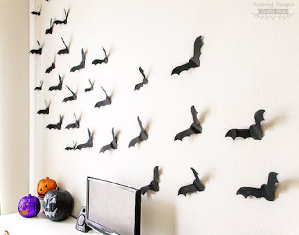 Mummifying your dorm room door is a great way to get in the spirit of Halloween, and you might even win a door decorating contest if your residence hall hosts that. All you'll have to do is cover your door with toilet paper/white streamers, and then add eyes in the middle. The eyes can be made by cutting out circles in colored construction paper, taping the circles together, and then taping the final piece to the door. You can add black construction paper in the back for contrast, but it's not necessary if your door is already a dark color (like brown wood).5. Paper bats