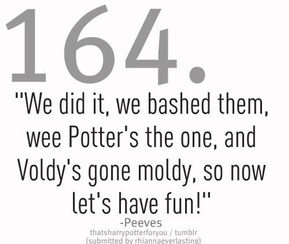 If you don't know who Peeves is, you probably only saw the movies. This oversight has been one of the pet-PEEVES of fans for years. Peeves the Poltergeist was one of the ghosts of Hogwarts in the books. He was always causing mischief in the castle and annoying Filch just for fun. The only people he ever respected or obeyed were the Weasley twins, Fred and George, who gave him orders to give Umbridge hell when they made their spectacular exit in the fifth book. And of course, we all wished his bit of comic relief was in the movie after Harry defeated Lord Voldemort when he sang "We did it, we bashed them, wee Potter's the one, and Voldy's gone moldy, so now let's have fun!"