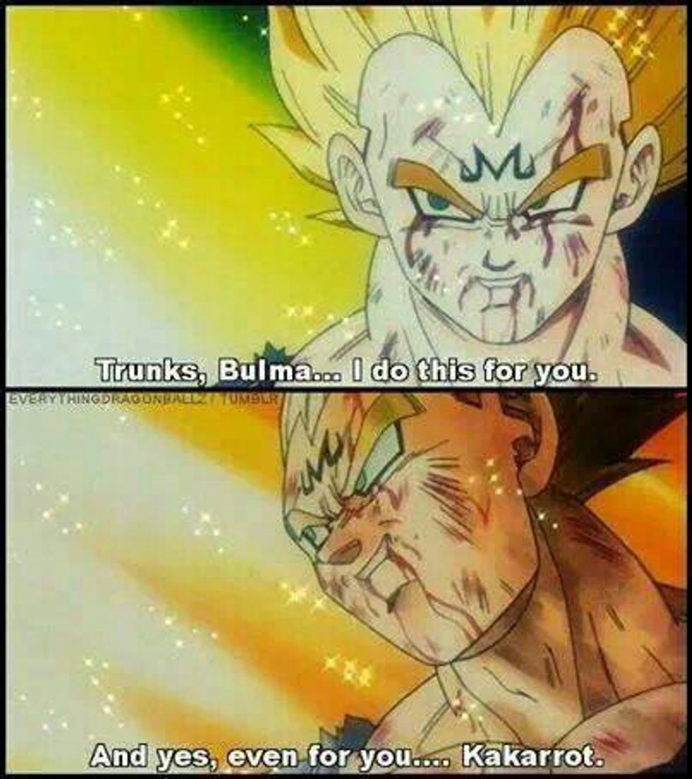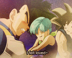 Don't get me wrong, I loved Bulma too. She was a little tomboyish (like I was), yet still feminine in many ways; she was also super smart. Her feisty attitude and humor set her apart. Like most DBZ fans I never saw the romance between these two coming, though individually they were both adored. This is probably why I like their relationship more than all of the Disney romances I'd seen as a kid. There are a lot of lessons about love that stem from what I've seen in Bulma and Vegeta's relationship.