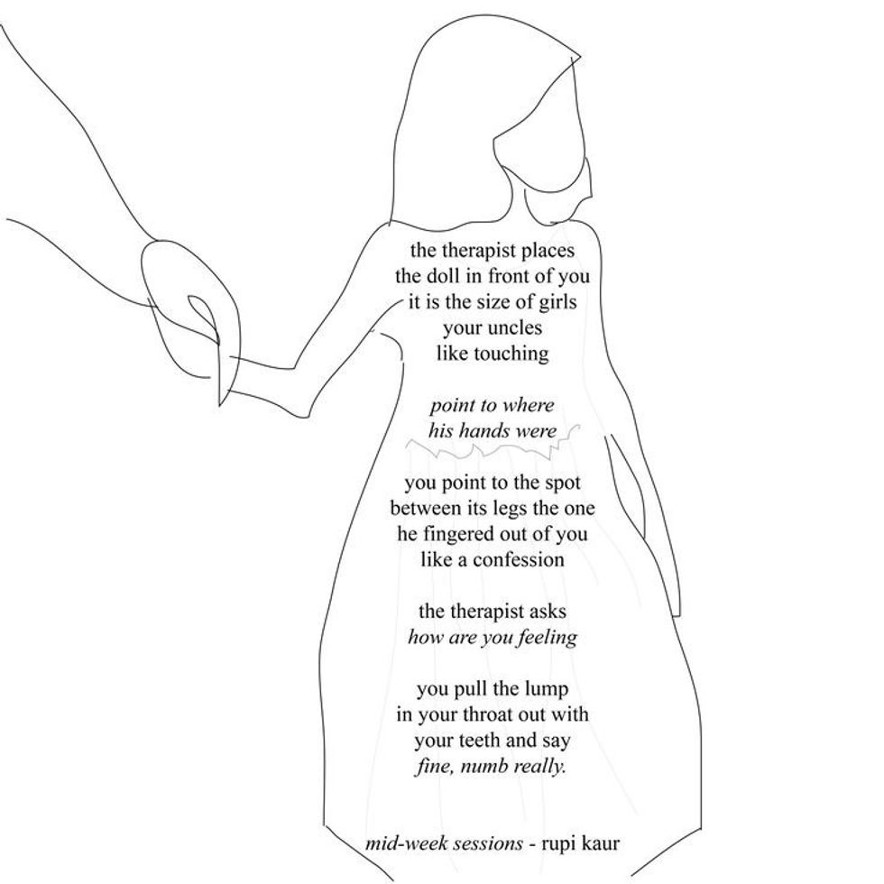 Rupi Kaur is an artist and writer currently living in Toronto, Canada and who is also an immigrant from India. Her highly acclaimed book, a collection of her drawings and poetry called milk and honey, carries themes of love, loss, abuse, femininity and empowerment. Her poems are beautifully simple and are accompanied by small sketches. They often cover difficult topics and resonate deeply with some readers. Below is one of her many poems which covers the unfortunate topic of child sexual abuse: