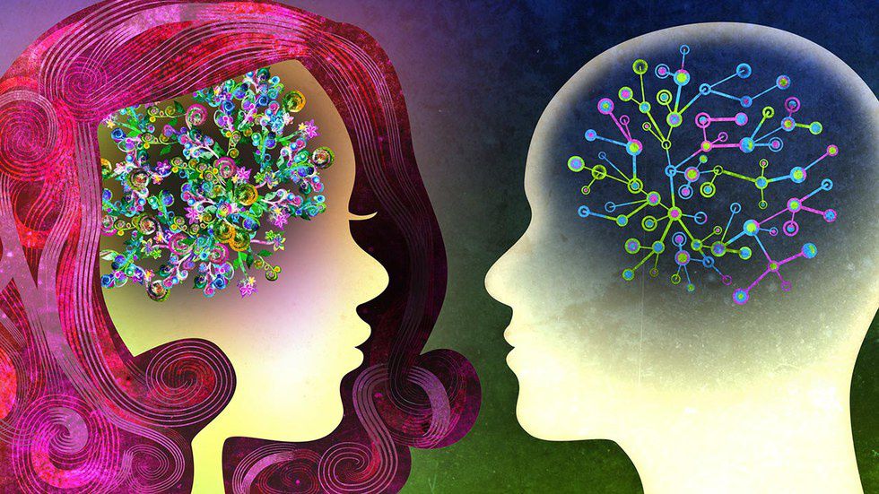 10. In humans, females have roughly 9.5 times more white matter in their brains than males, while males have roughly 6.5 times more grey matter. So, if the brain was a computer, women would have more connections between the computer chips and software, but men would have more of the chips and software, but less connections between them.