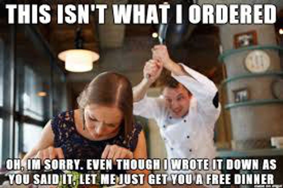 "You get two sides." "What sides do you have" *recites all 20 sides* "I'll have fries and a salad." "What kind of dressing would you like?" "What kind do you have?" *recites all 10 dressings* "I'll just have ranch." Oh you needed me to recite all 20 sides and 10 dressings to you for you to get the most popular sides and dressing that literally every restaurant has? *moves on to next person at table* "What sides do you have? I wasn't paying attention" *repeats entire process four times until the table finally finishes and you are practically twitching*
