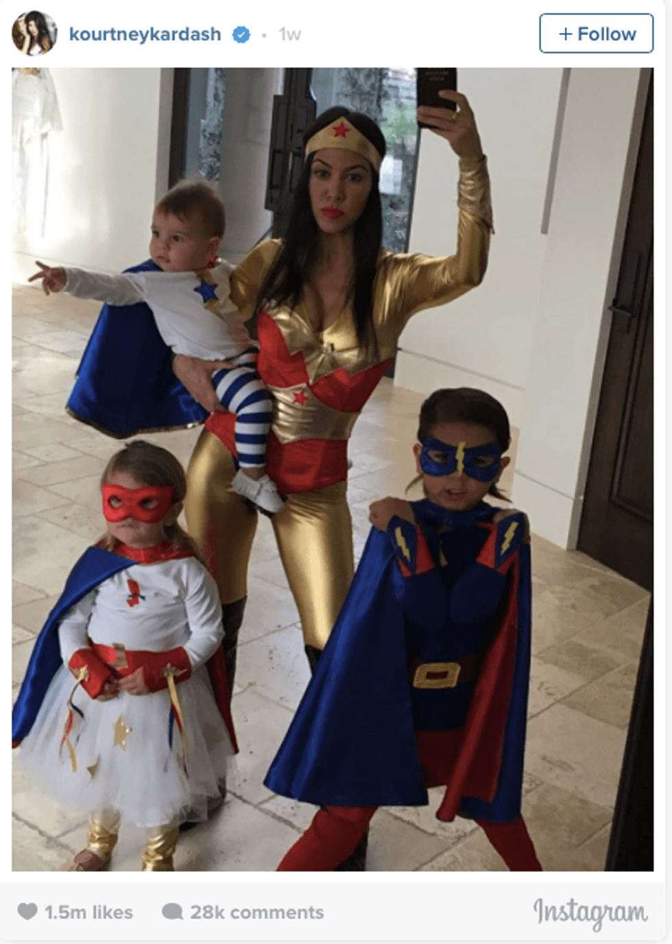 Kourtney has taught us to love your (future) kids. She really is a supermom and always is putting her children first. Who else would take the time to find four perfectly matching costumes to get this great pic?