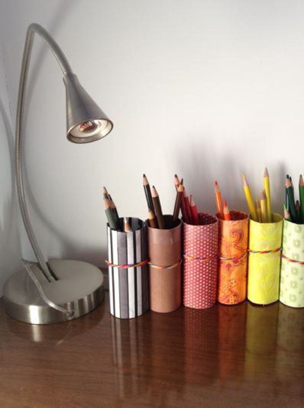 7. Avoid waste by decorating toilet paper rolls to organize everything on your desk.
