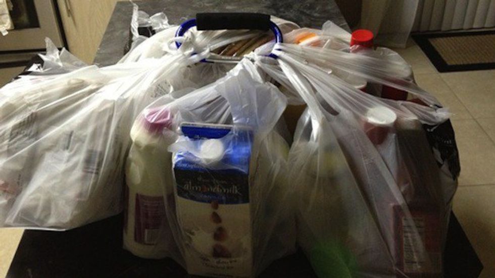 10. Make the walk home a little less of a struggle by using a carabiner to hold together a trip's worth of groceries.
