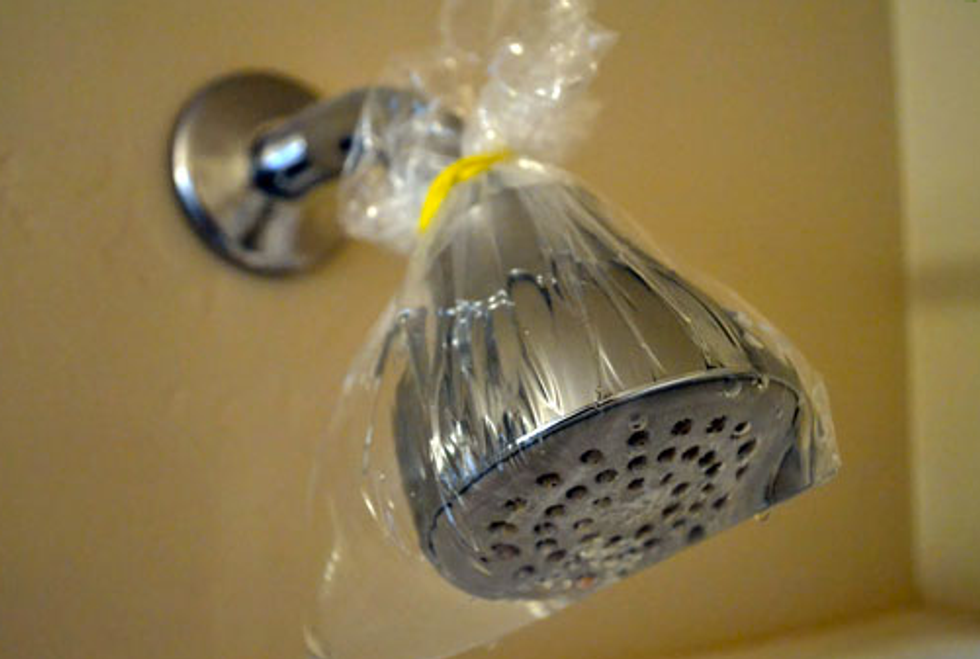 4. To clean the shower head in your dorm/apartment, tie a bag of vinegar around it and leave it overnight to get all of the residue off with no work!
