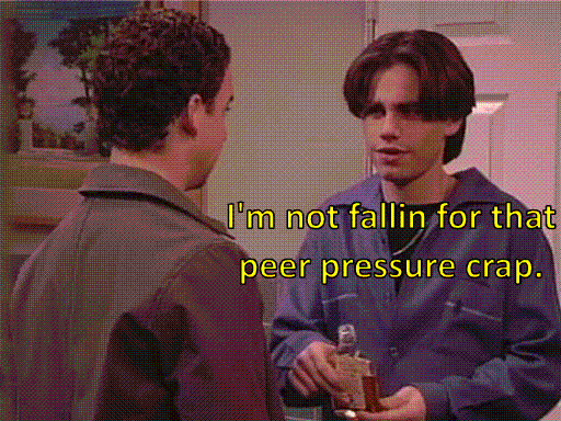 When Cory and Topanga broke up, Cory had a difficult time coping so therefore he turned to drinking. He used alcohol to make himself feel better which in turn didn't. The moral of the story is that if you're feeling that bad, you should talk to someone rather than turning to illegal substances. Life throws you bumps in the road, don't take the easy way out. Work through it with the help of family and friends.