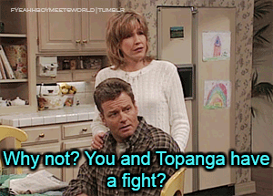 Throughout the entire show, Amy and Alan have not always agreed with their children. When Topanga wanted to live with their family after running away from Pittsburgh, Amy was against it because she felt that it was unfair to pull Topanga away from everything she knew. When Topanga and Cory got engaged at graduation, she felt they were too young to be making such rash decisions. Even though Cory could not always see her point of view, she always had his best interest at heart. Parents only want to see their children live full and happy lives. Even though we can't always see their motive right away, we need to trust that they know us and wouldn't steer us in the wrong direction.