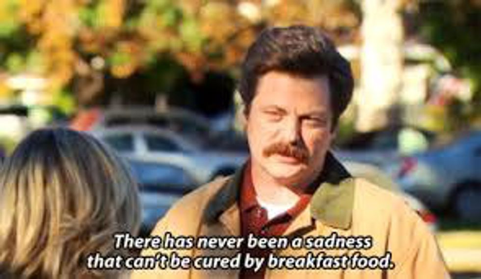 Although this was already an undisputed truth, Ron succinctly epitomizes it in this moment. Come sunshine or rainy day, breakfast food can take the pain away.