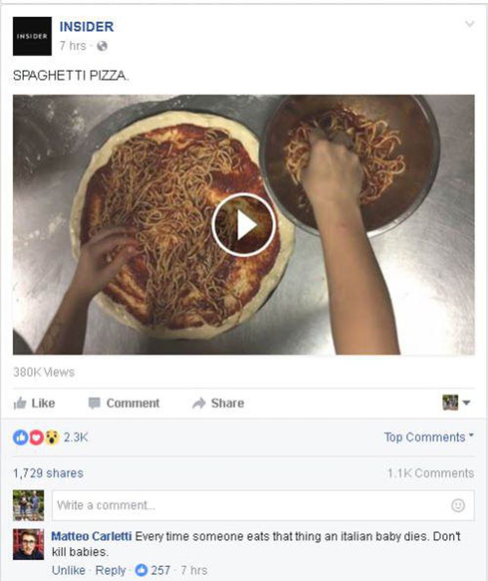Fast forward to a few minutes ago. I’m on Facebook browsing my Timeline. I’m scrolling down, oh another kid! I would have never expected! I’m scrolling some more and I see a video of someone putting spaghetti on a pizza. How disgusting, but the top comment is funny.