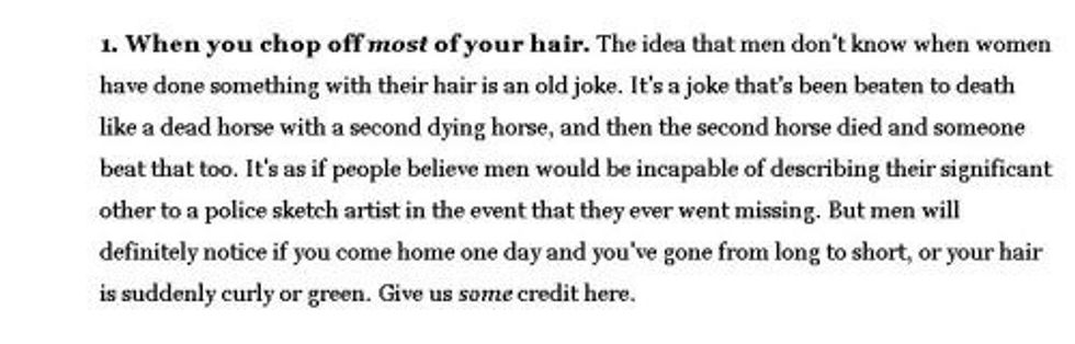Then the ultimate funny comes, and it’s a Cosmopolitan article. 10 Little Things He Always Notices About You. It’s go time, let the debunking begin.