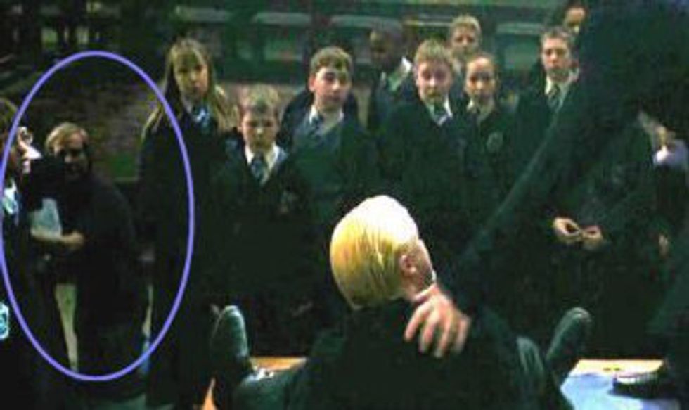 Harry and Malfoy fight in a duel. Soon after, Harry casts a spell causing Malfoy to spin in the air. After landing on his arse, the other students laugh at Draco. Quickly, Professor Snape helps Malfoy get back on his feet. However, in this shot, a cameraman can be seen on the far left of the screen.