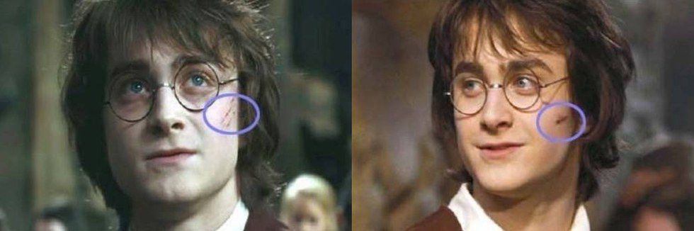 At the end of the film, Harry has a few small scratches on his left cheek when he says goodbye to his headmaster, Dumbledore. Suddenly, the wound changes to a deeper, single scrape when he says farewell to his friends, Ron and Hermione.