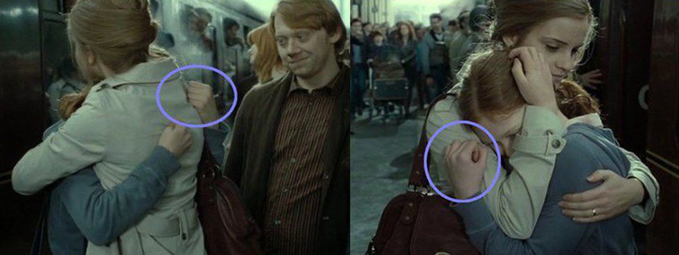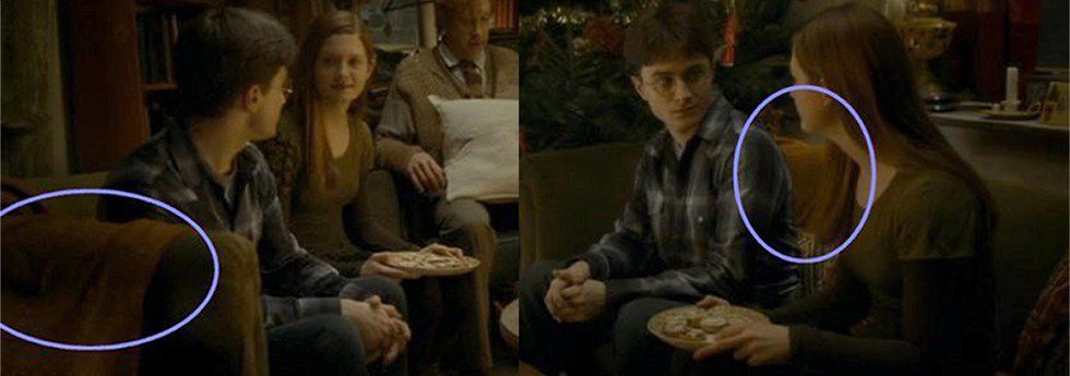 At the Burrow, Harry is speaking with Lupin, Tonks, and Arthur. When Ginny joins him on the couch, the orange blanket is placed on the sofa's arm. In the next shot it's on the back of the sofa. It continues to flip back and forth between these shots.9. Art School ('The Deathly Hallows, Part 1', 2010)