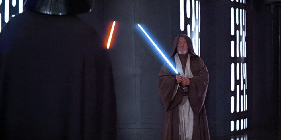 The fight between Ben Kenobi and Darth Vader ends tragically, but the scene itself is pretty intense... Minus the visible wires. In certain positions, the white wires to light the saber are spotted. This isn't even the only scene in the movie where this happens. After the movie's release, lightsabers are no longer practical effects, but rather created in post production.