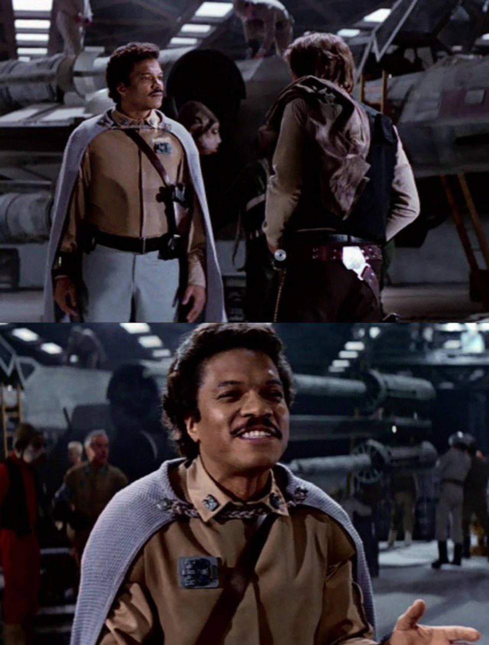 At first, Lando’s holster is fastened on his right shoulder. When Han walks away and turns back, there is a shot of Lando saying, “Would you get going, you pirate?” Clearly, this shot is reversed. Lando's holster is fastened on his left shoulder, and his insignia is on the other side of his chest.