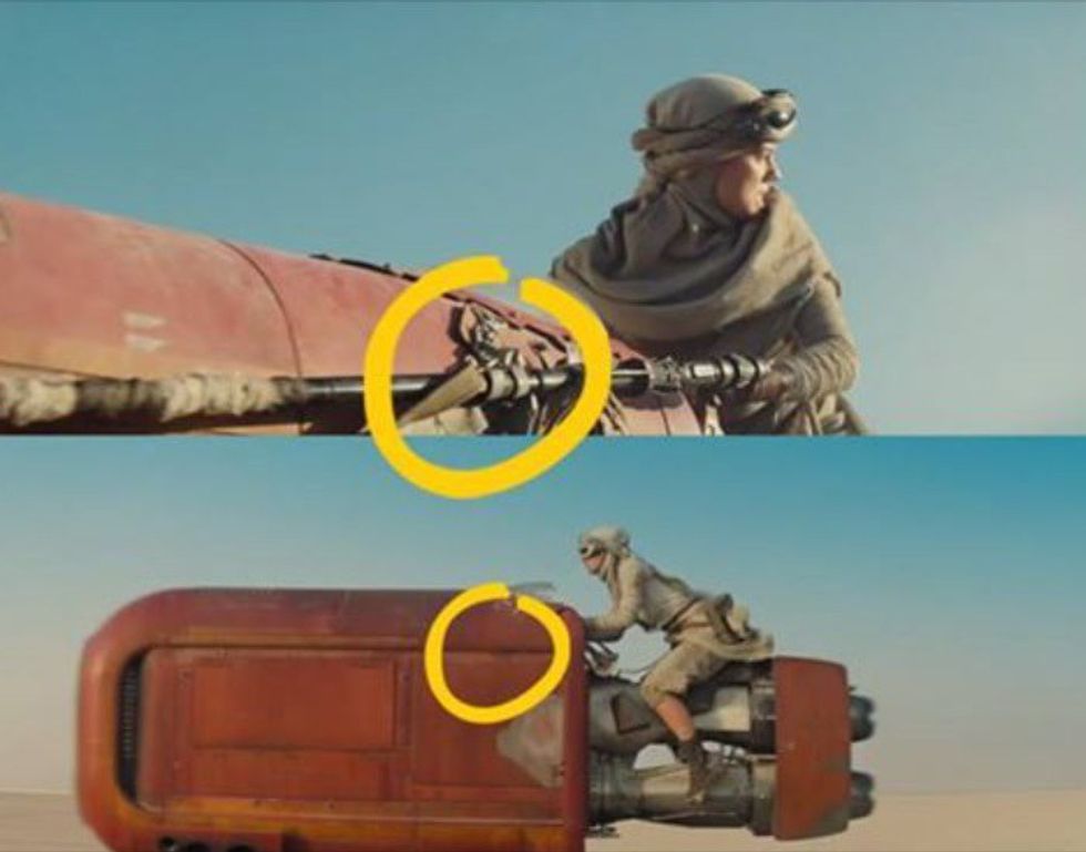 When Rey jumps onto her speeder, she places her staff on the left side of the speeder. In the wide shot, the staff appears on the opposite side.