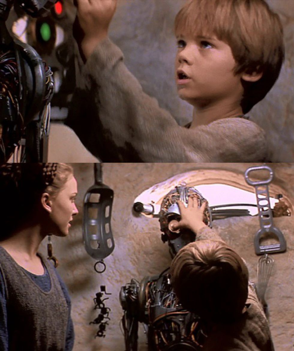 When he turns on C-3P0, he quickly remembers to put in the droid’s other eye. Anakin picks up C-3P0's right eye with his left hand. However, in the wider shot, Anakin uses his right hand to attach the eye.
