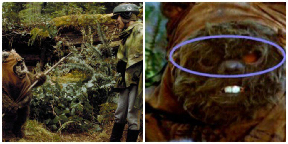 On the planet Endor, there is one Ewok that isn't quite like the others. The costume didn't quite fit the extra correctly. The audience can see the eyes and mouth of the person inside the Ewok costume.