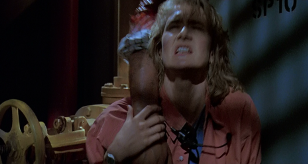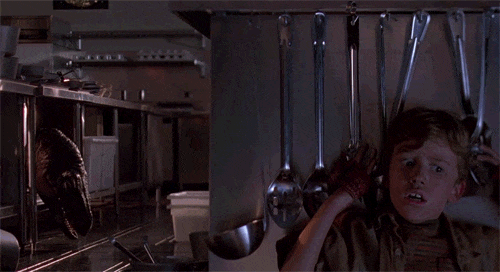 Dark kitchen scenes have been featured in numerous horror films, but the combination of raptors and poor Tim’s horrified eyes take this scene to an entirely new level of scary.