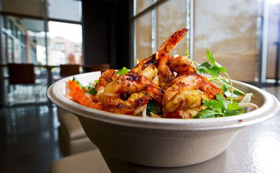 My recommendation: 5-spice grilled chicken bowl, steamed jasmine rice, stir-fry veggies, crispy shallots, fresh lime wedge, Sriracha blend sauce, and a double order of sesame sauce. Grab a cold grapefruit Izze on the side and you're golden.