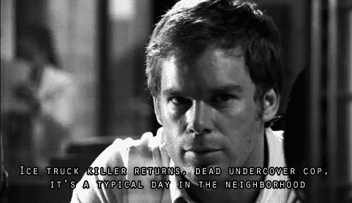 One of my all time favorite law enforcement shows! Dexter murders people who do wrong. While I am still on Season 1, so much has already happened! One of my dear friends actually mentioned this show to me.