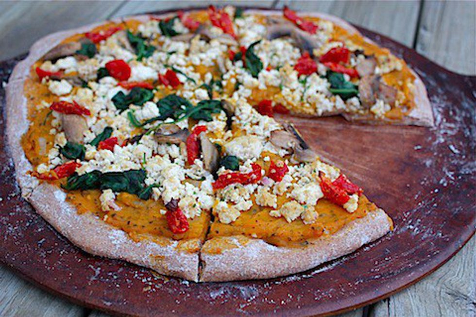 - Place pizza on pizza stone or round baking sheet and spread a thin layer of hummus on the crust. Spread pumpkin sauce evenly over the hummus layer and sprinkle on 1 cup of tofu ricotta.