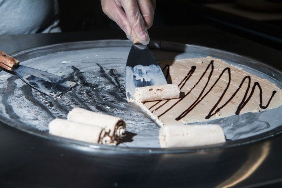 7. It's fascinating to watch (but more-so than Cold Stone). My initial impression was that it looked like an omelette station at the dining hall, but the "stove" surface is obviously cold. What freezes into a sheet of thin ice cream is turned into smaller, rolled up pieces. Here's a brief description of the technique, from the company website: