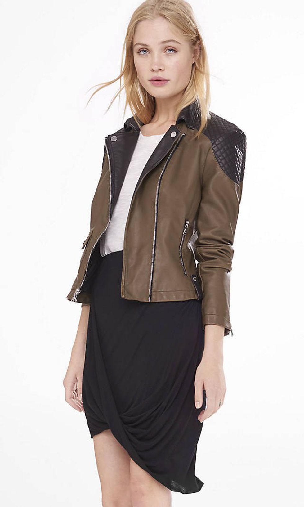 3. "Color Block Quilted Shoulder Moto Jacket" from Express $70.80. This edgy moto jacket is ideal for slipping out for a night on the town.