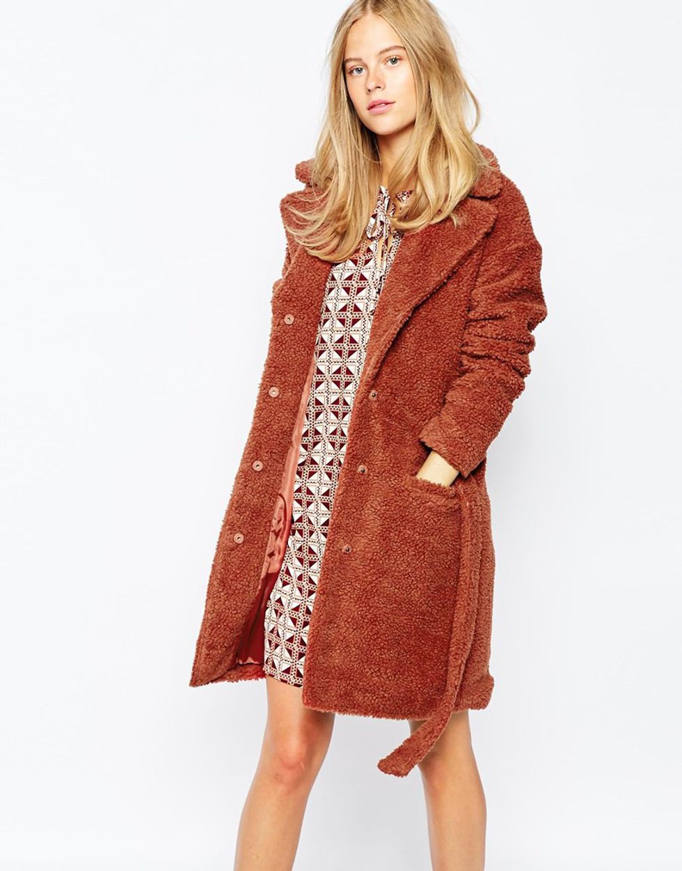 6. "First & I Faux Teddy Fur Coat" from Asos $54. The playful color and whimsical texture of this jacket make it a great quirky statement winter coat.