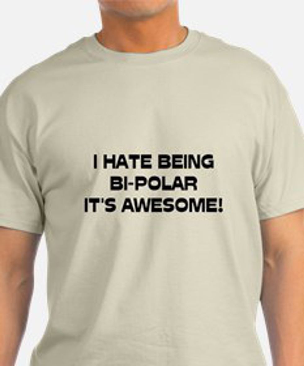 First of all, mental illness of any kind isn’t “awesome.” It can cause people to physically or mentally harm themselves. The second problem with this shirt is that it makes light of bipolar disorder, which isn’t something to make light about. Remember: Mental illness isn’t a joke.