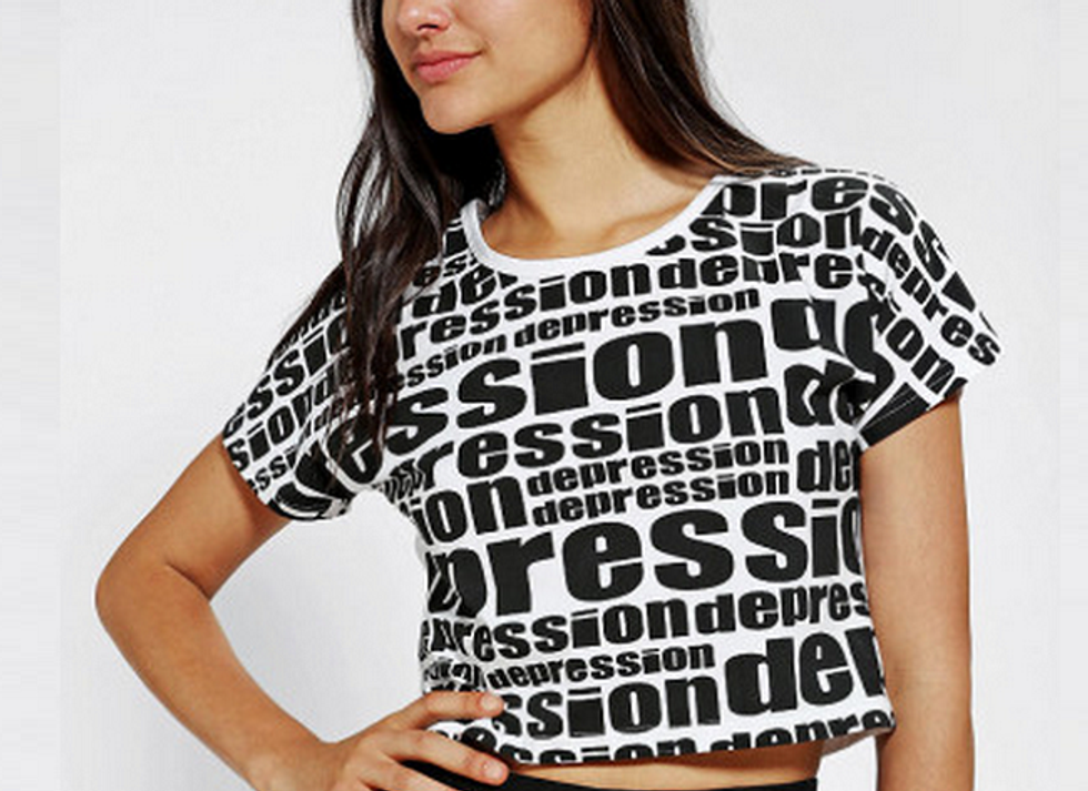 This is a classic example of glamorizing depression, which is a serious mental illness that many children and adults suffer with in the United States. This shirt was also manufactured and sold at Urban Outfitters, and it was taken out of the stores and off of their website because it received harsh criticism for glamorizing depression. Depression, as well as all other mental illnesses, are not fashion statements and should be taken seriously.