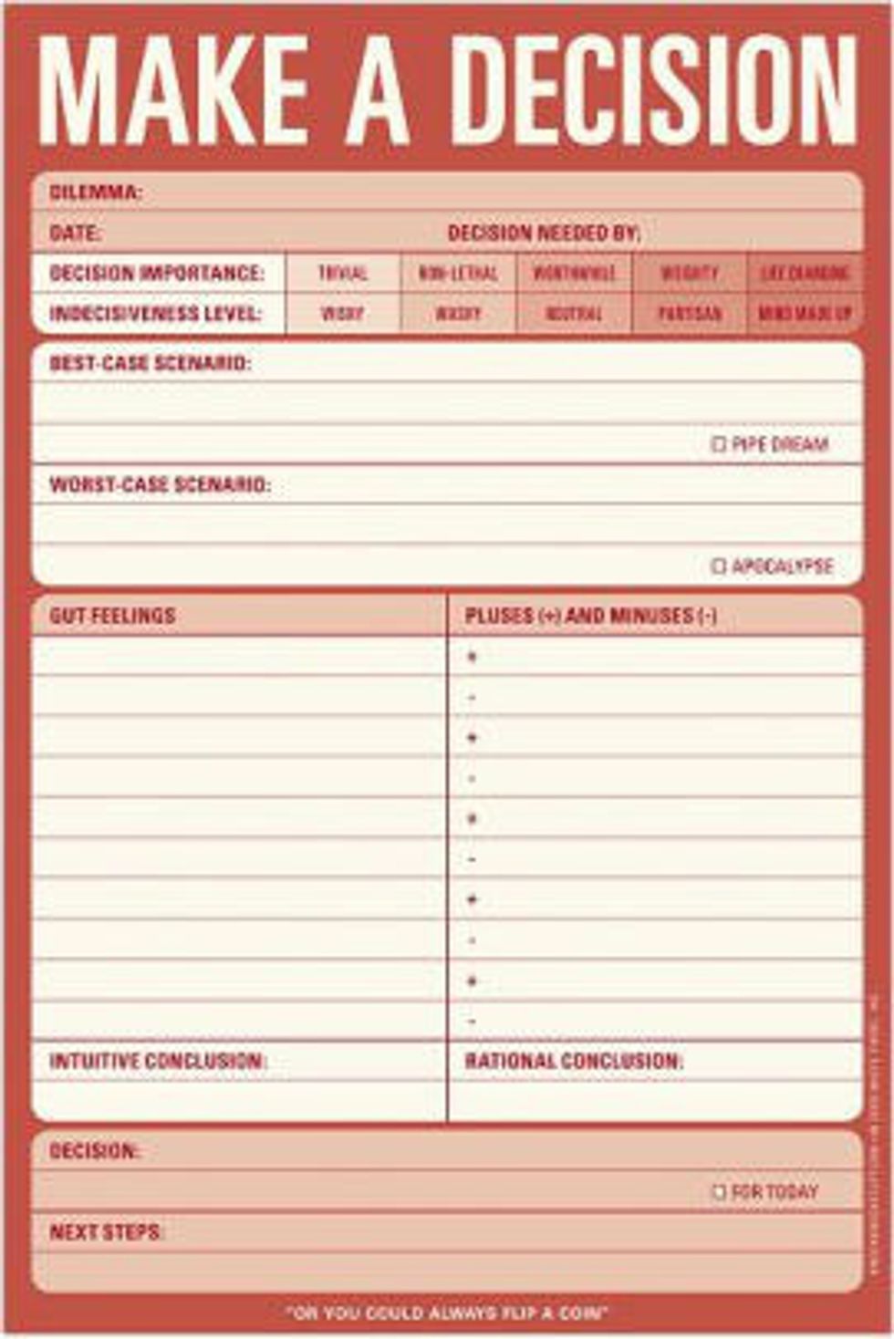 The perfect passive aggressive way to get neighboring co-workers or roommates to hear you out. Also, for personal benefit, you can make a decision by writing pros and cons out on paper. Humorous yet proactive, this is a perfect addition for a desk close to you.