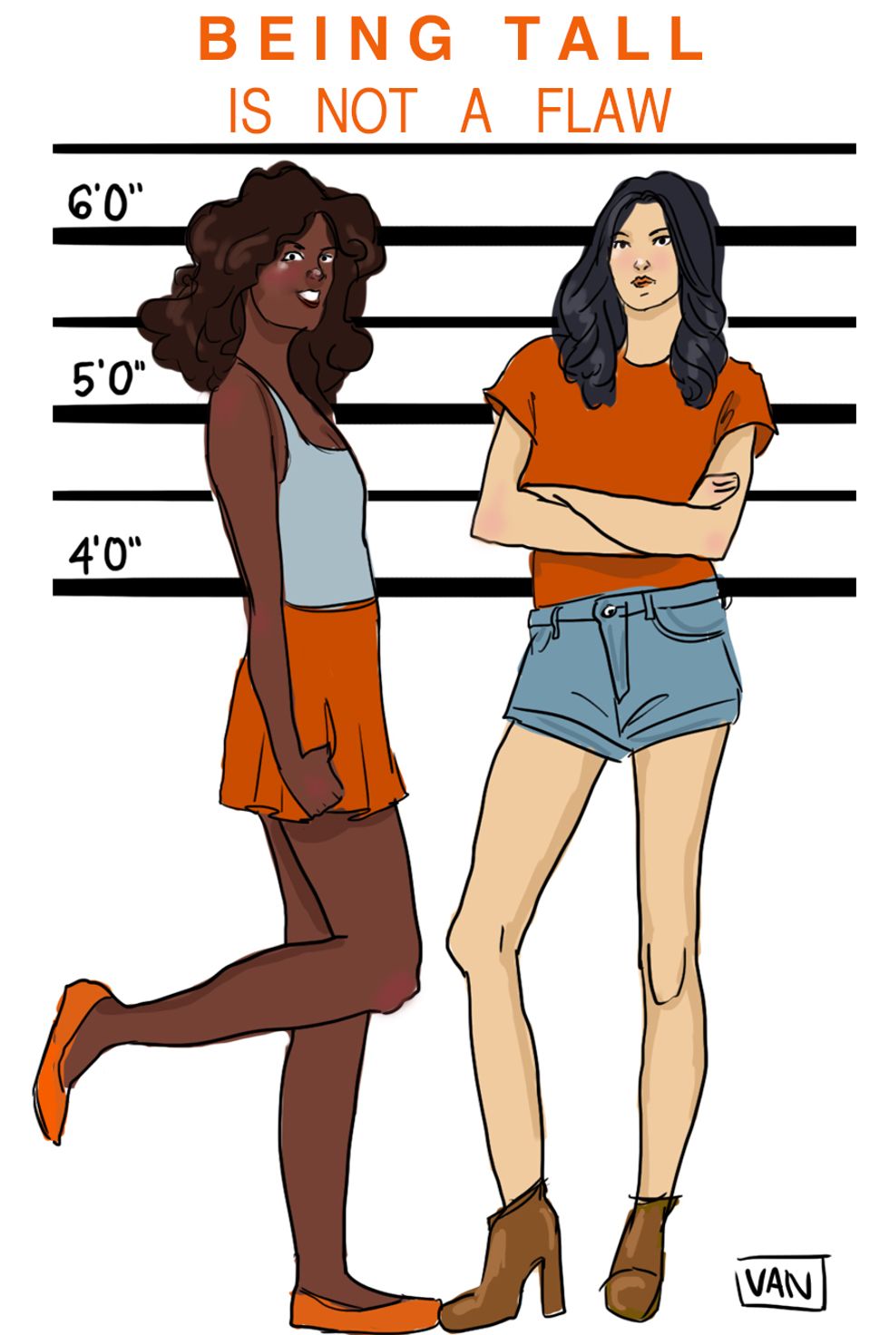 Okay, so I am almost 5'11 and let me tell you, I was not the tallest girl in the room. (Shocking, right?). There were girls towering over six foot that would have to duck under doorways and cramp in their seats. I feel for those girls because basically, I am those girls. We are called linebackers, basketball players, giants, you name it. I have never seen a meme praising how "cute" we are or that we are winning. Although it is common to see models being of our stature, we don't look like them and they don't even look like themselves. Being constantly picked on in school about not finding dates was hard, like really hard. I had friends who had guys calling after them but not me, and it started with a guy telling me no guy would date me in high school because I was a giant. Well, that got me thinking on the obvious reasons why short girls might be cute, but why can't tall girls be appreciated too? and not have to be a model to do that. So here's to us, the linebackers, basketball players, and giants.