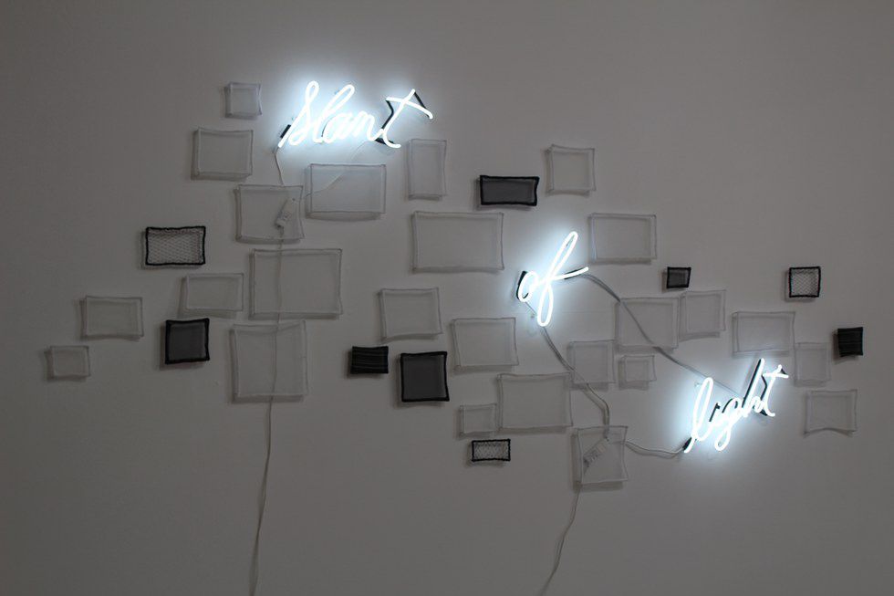 Her "large-scale, immersive sculptural installations play with weight and mass, creating pattern, color, and light from everyday materials" including an old coffee table that her dog chewed up.