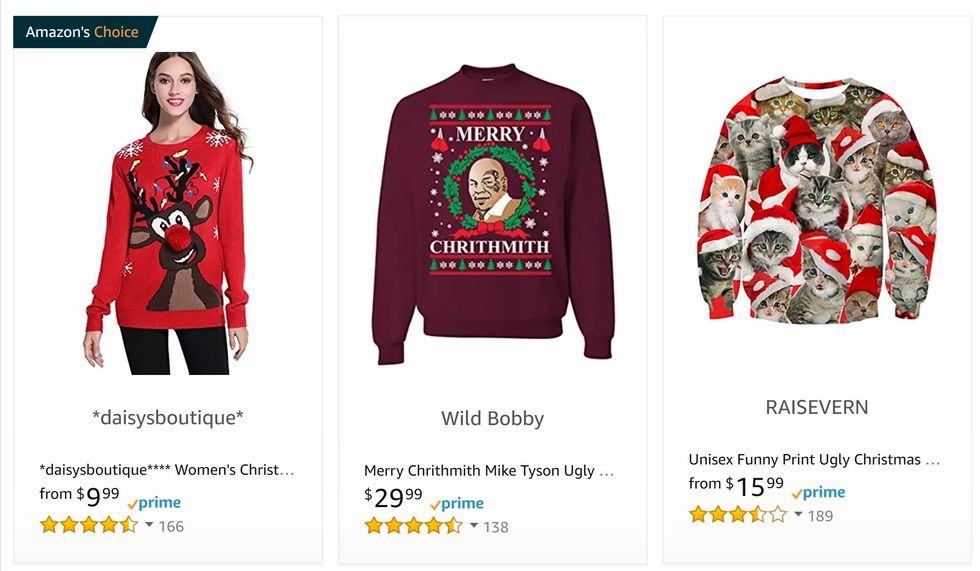 If Amazon is known for one thing, it's variety. A reindeer with a big fluffy red nose? A cat riding a magic pizza carpet? Santa riding a dinosaur? I guarantee you could find any and every type of Christmas sweater here (and even some extremely ugly suits, if you want to up your game). Not only that, but with Amazon Prime you can order it last minute and still look your best at that Christmas party!