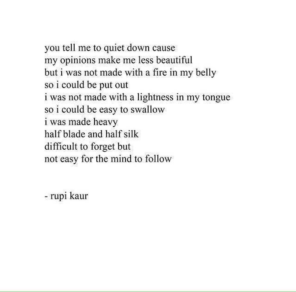 We all have "fires" in our belly that sometimes people want to put out. But frankly, Rupi Kaur's words let me believe that people who try to tame your greatness are not worth your time, and that to be passionate is to be strong. It'd be weak to allow people to quiet you down.