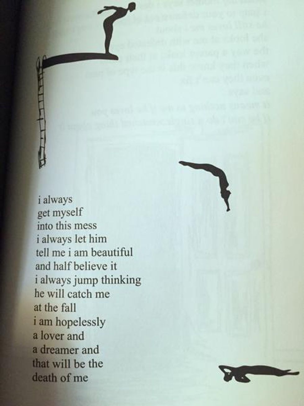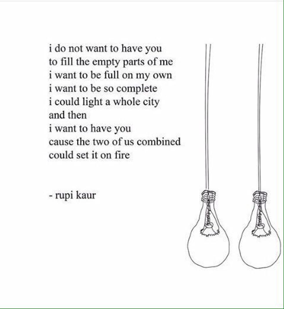 This poem says a lot. It's so inspiring because I feel like so many girls think they're not complete without a guy. But that shouldn't be the case. We can have someone make us better or make our lives better, but the key word is better. You have to be happy on your own before you have anyone. I especially love how Rupi Kaur has the constant theme of "fire" throughout her poems, because it is so metaphorical for strength, bravery, growth, passion.