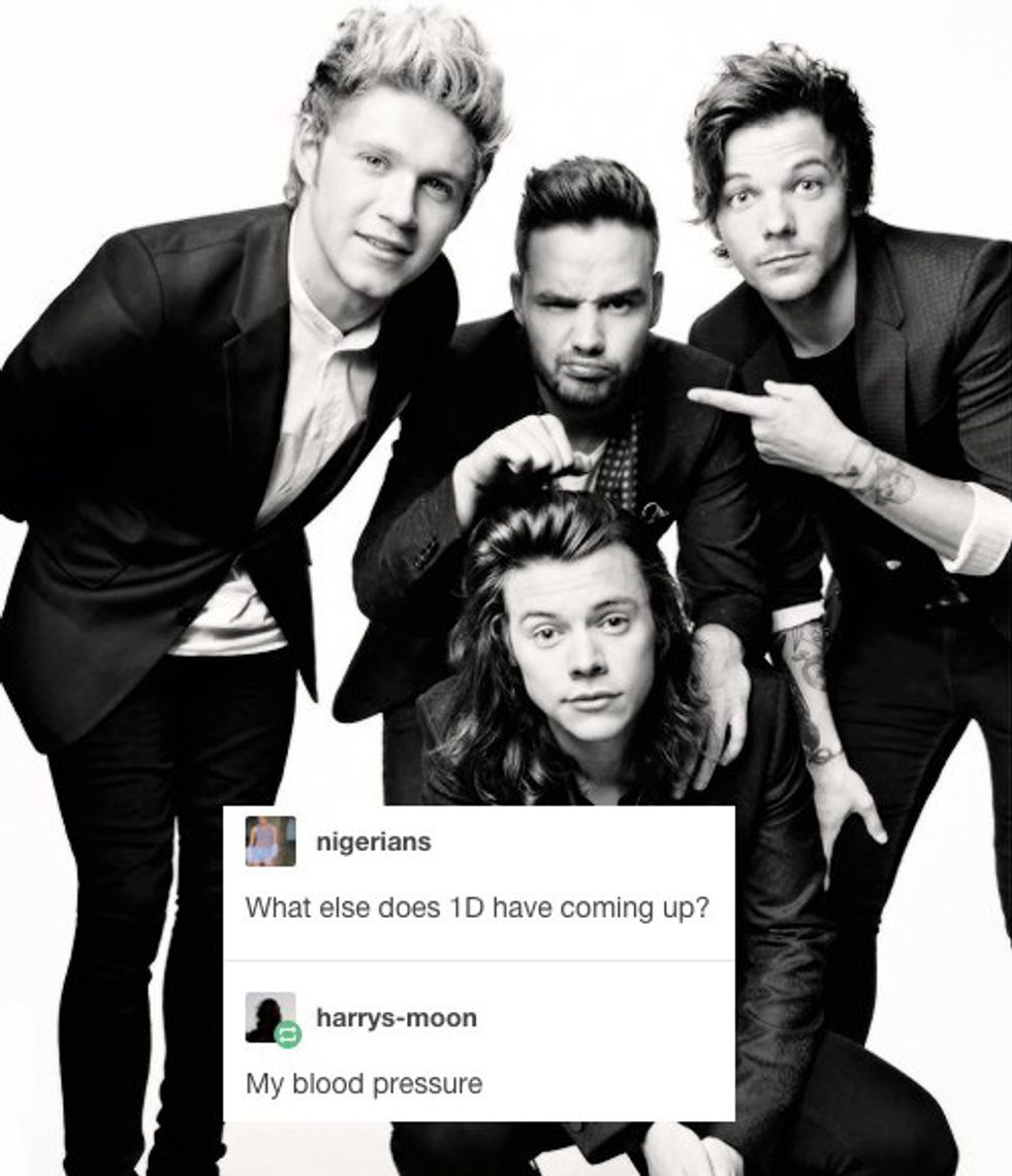 This is, without a doubt, highly accurate, especially with all of the drama that has been surrounding these boys lately. From Louis becoming a dad to Liam signing a solo deal, the One Direction members have been trying to keep busy while on their hiatus. However, that does not mean that fans will not keep themselves from worrying in the slightest or hyping things up. So, yes, One Direction does cause high blood pressure.