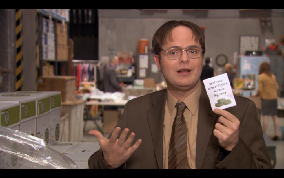 Jim tricks Dwight that these beans he got on his honeymoon are magical, but they most definitely are not magical in any way.
