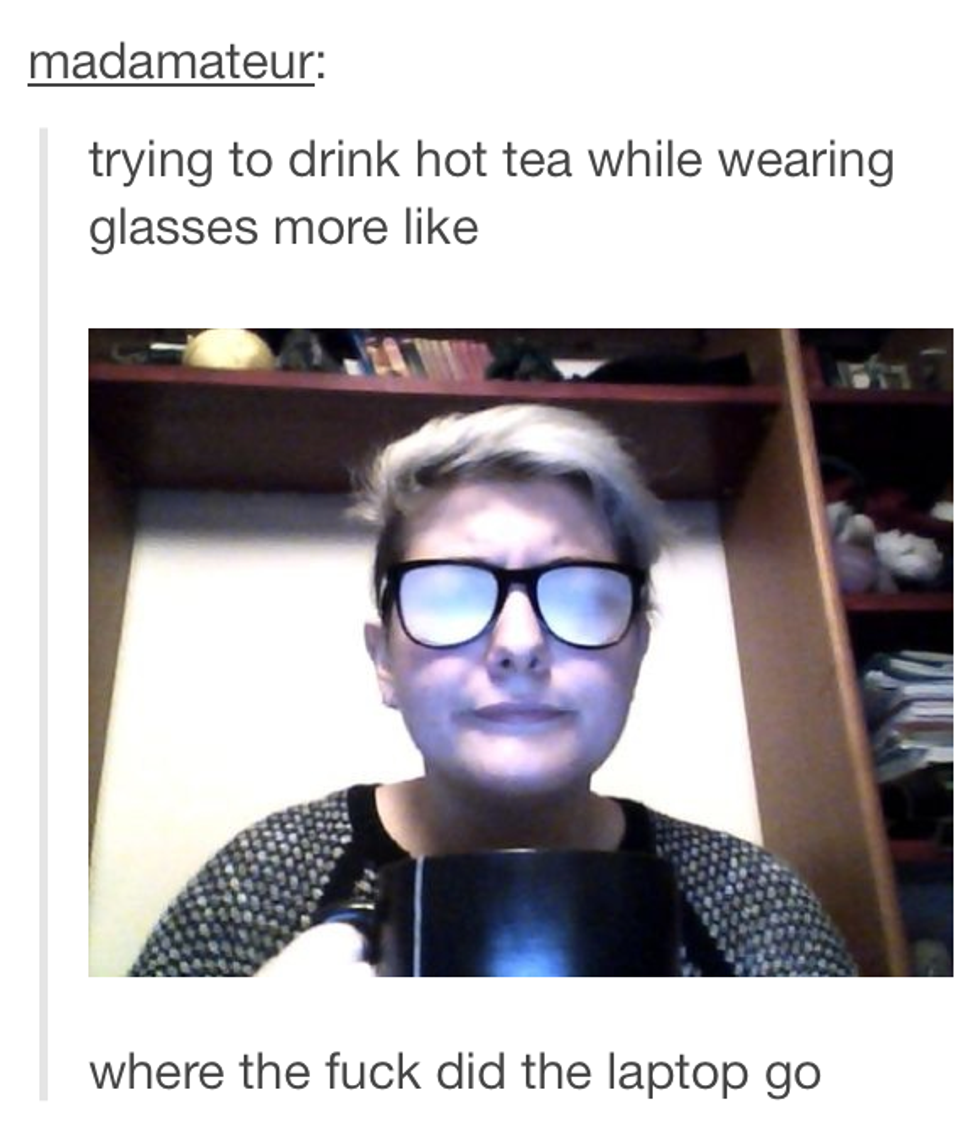 Something seems skewed with this logic, I know. Unless you have glasses this probably sounds crazy to you, but it works. The only issue being you look like you're plotting to stomp on every pair of glasses in the world with that look on your face.