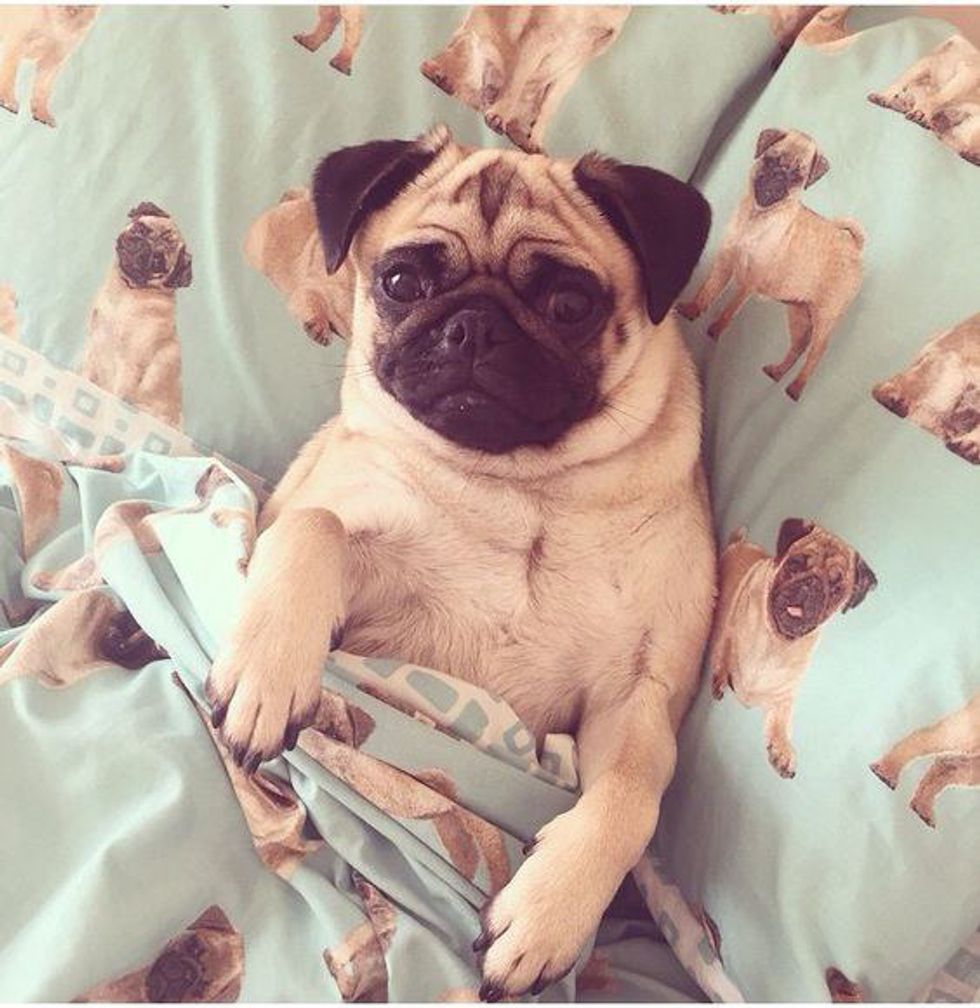 2. A pug snuggled in bed on pug printed sheets.