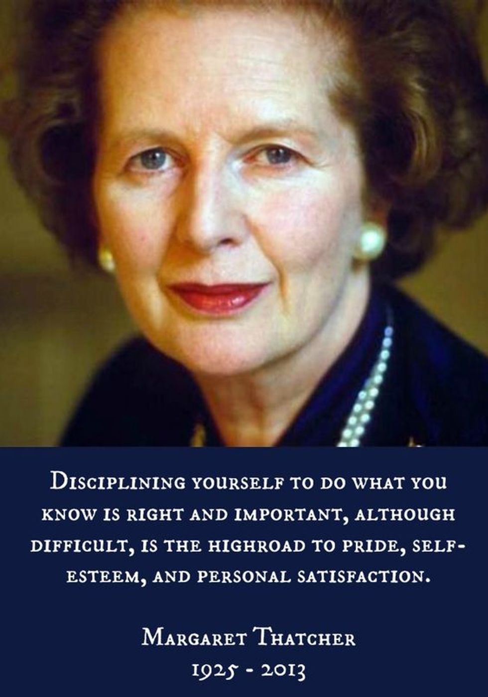2. "Disciplining yourself to do what you know is right and important, although difficult, is the highroad to pride, self-esteem, and personal satisfaction." - Margaret Thatcher