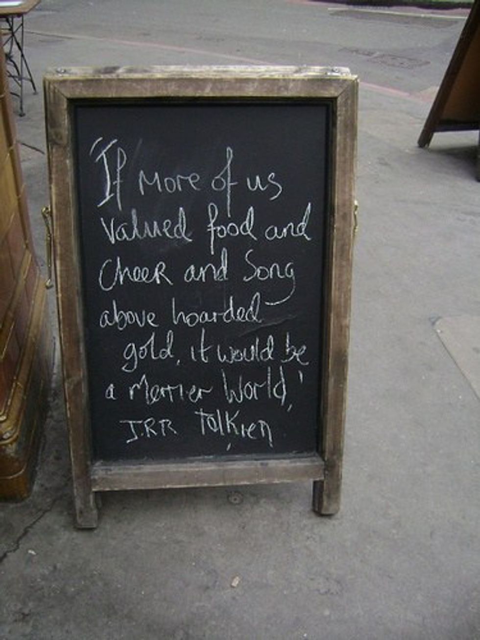 - "If more of us valued food and cheer and song above hoarded gold, it would be a merrier world." --J.R.R. Tolkien