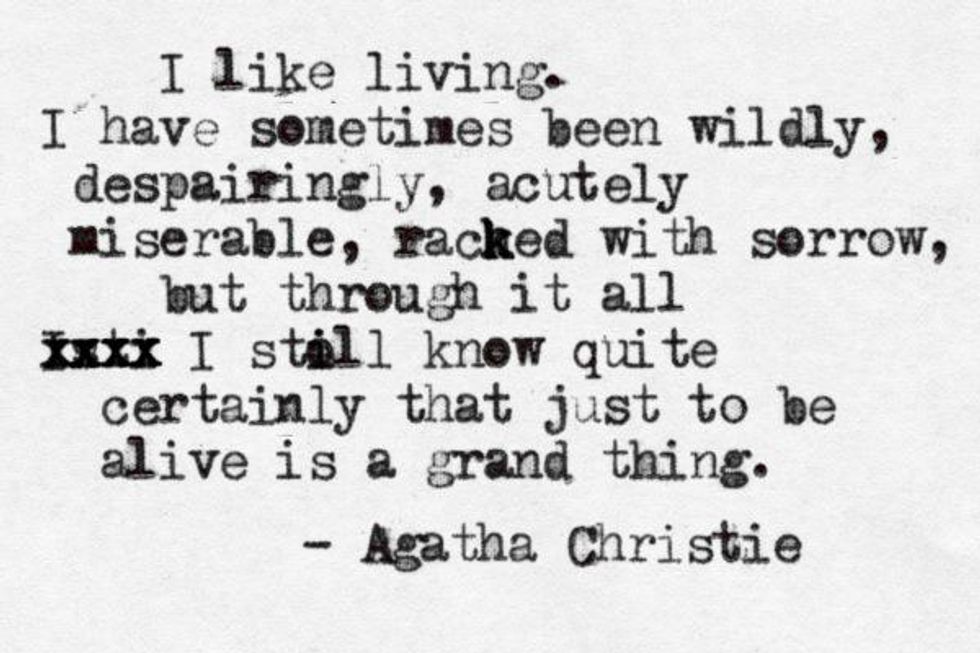 - "I like living. I have sometimes been wildly, despairingly, acutely miserable, racked with sorrow; but through it all I still know quite certainly that just to be alive is a grand thing."