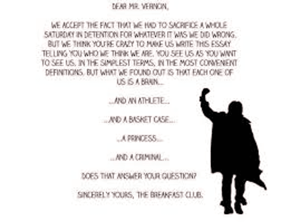 The end of the movie essay really ties together the whole movie beautifully. When Mr. Vernon first sees all these kids in detention, he refuses to see them as anything else except for their stereotypes. When we first see the characters, we see them as their stereotypes as well. As the movie goes on, we start to discover that these kids are more similar than we think. They all experience pressure put on them by parents, they all can be conceited at times, and they all have issues with how they see themselves. They all end up seeing traits of the other people in themselves. Granted, Andrew isn't going to start robbing the nearest grocery store, but you get the point. All of us deep down are the same, we just have to get beyond the surface to see that.