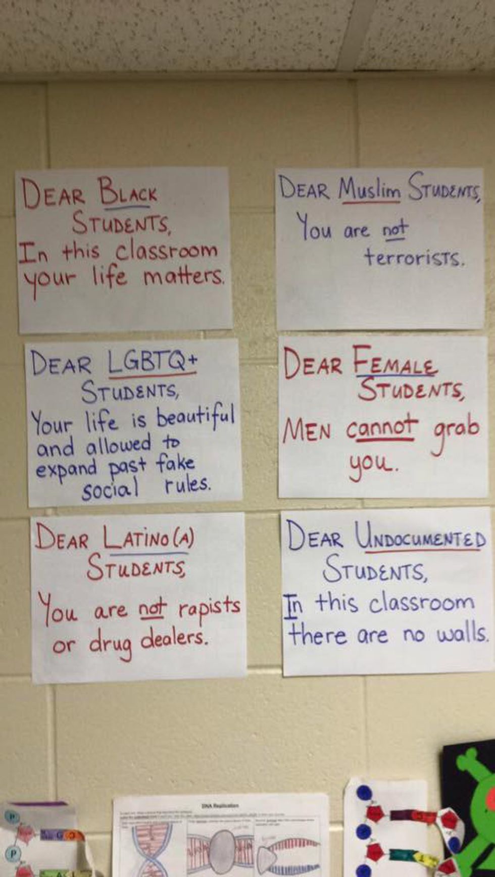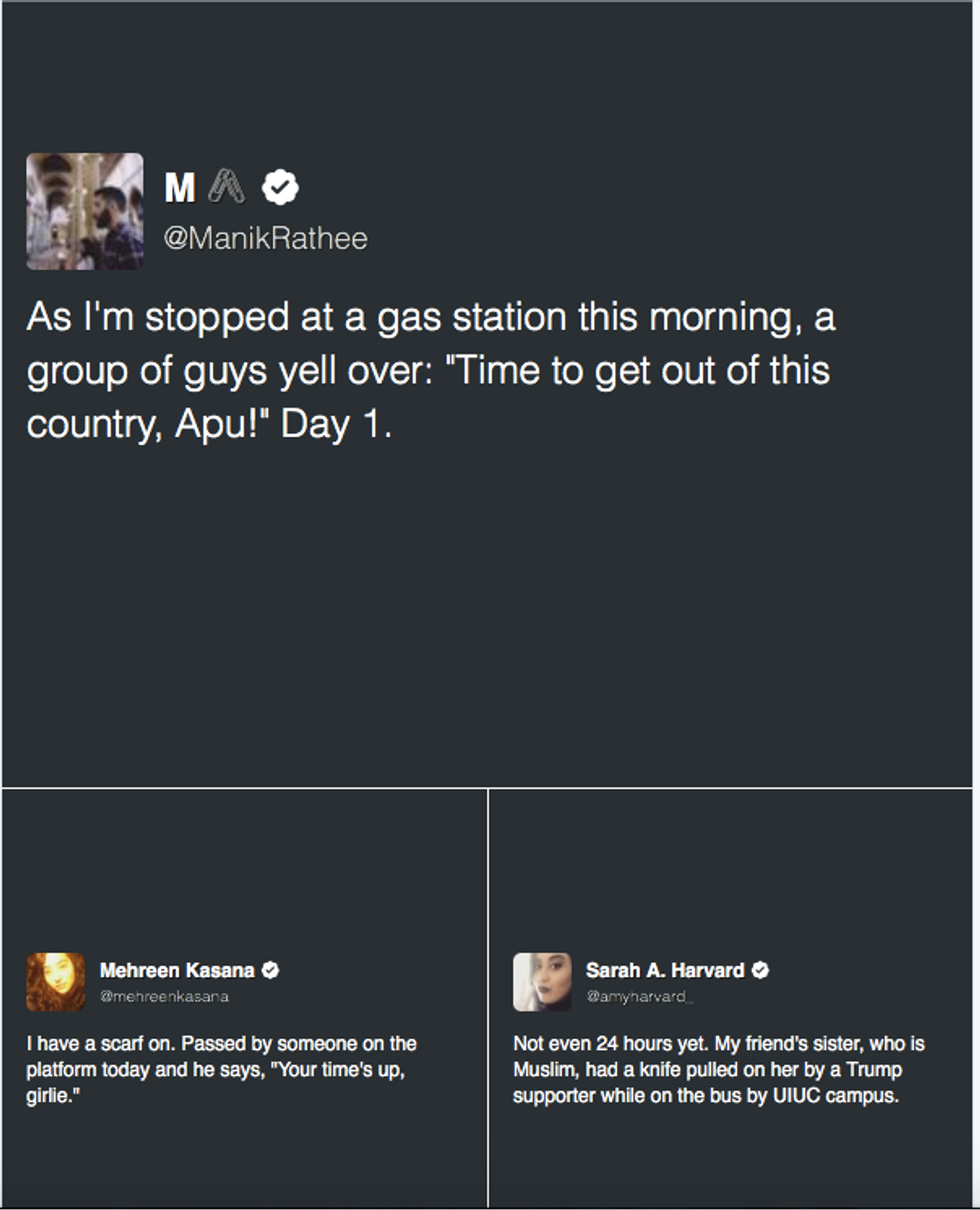 "I never knew that there were so many sexist, racist, and idiotic people who live in this country until I found out who won this election. I'm honestly scared because I've been reading about what has been going on since Trump was elected. Someone wrote on a wall "make America white again" and drew a swastika. People have been killed! I'm terrified to leave my room. I go to class and I get scared every time I hear a loud crash of sorts."