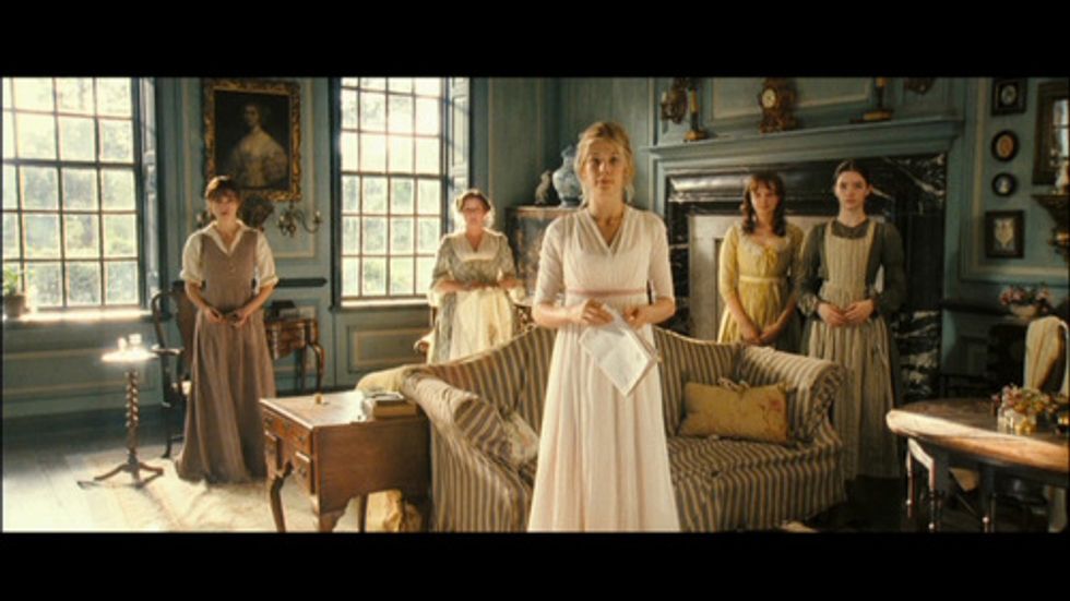 I just want to take one moment to admire the costume department for dressing each one of the Bennet gals in personality-appropriate attire? We have our dearest angel Jane in soft, pretty colors, for the delicacy and innocence with which she approaches life. Then we have Lizzy, who is known for her sense and personality, the only one not adorned in a hat, also wearing drab clothing to showcase how her liveliness of spirit, does not depend on extravagance. Then we have Kitty and Lydia, in bright, silly colors and lots of frills and ribbons to demonstrate their frivolity, as well as Mrs. Bennet, who is more extravagantly dressed than any of them. And last we have our Mary, who is all things solemnity and erudite, dressed sensibly in dark earth tones.