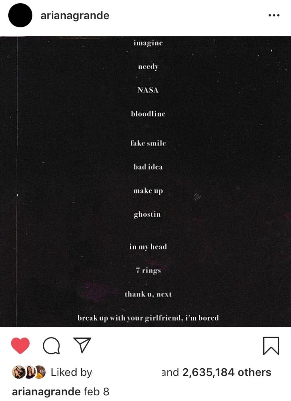 Ariana posted to her Instagram on January 22nd that her new album, titled "Thank U, Next," will be released on February 8th, 2019. This will be her 5th studio album, her fourth being "Sweetener" which was released in August 2018. She's already released "Thank U, Next", "Imagine", and "7 Rings" as singles, and if the album is anything like those, it is sure to be just as incredible.