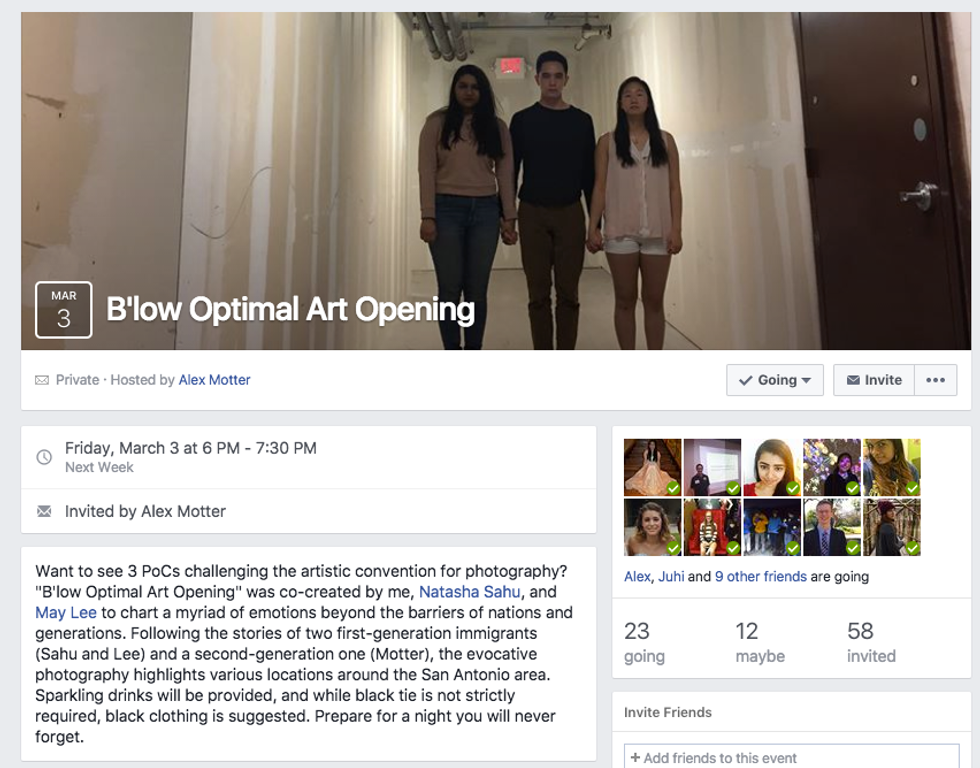 The "B'Low Optimal Art Opening" is an upcoming art exhibit presented by newcomer visionaries and photographers, entitled The Other Asia, comprised of Alex Motter, May Lee, and myself. This event will be held in CSI 488 on Friday, March 3rd, 2017, and will showcase the photography taken by the three of us on a random San Antonio Saturday.